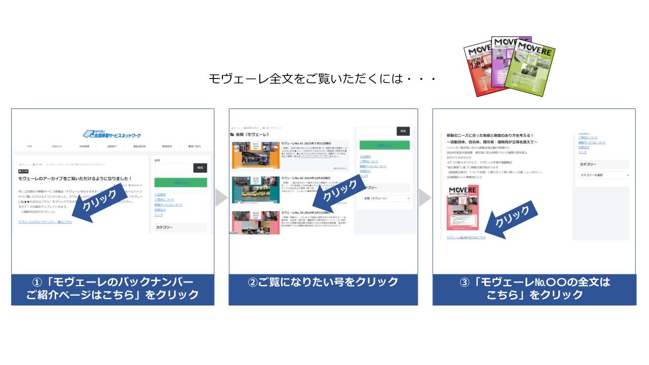 年に2回発行の移動サービス情報誌「モヴェーレMOVERE」のアーカイブ※を、ホームページからご覧いただけるようになりました。モヴェーレのバックナンバー一覧にある各号の「モヴェーレ№●●の全文はこちら」をクリックで全文をお読みいただけます。是非ご活用ください。