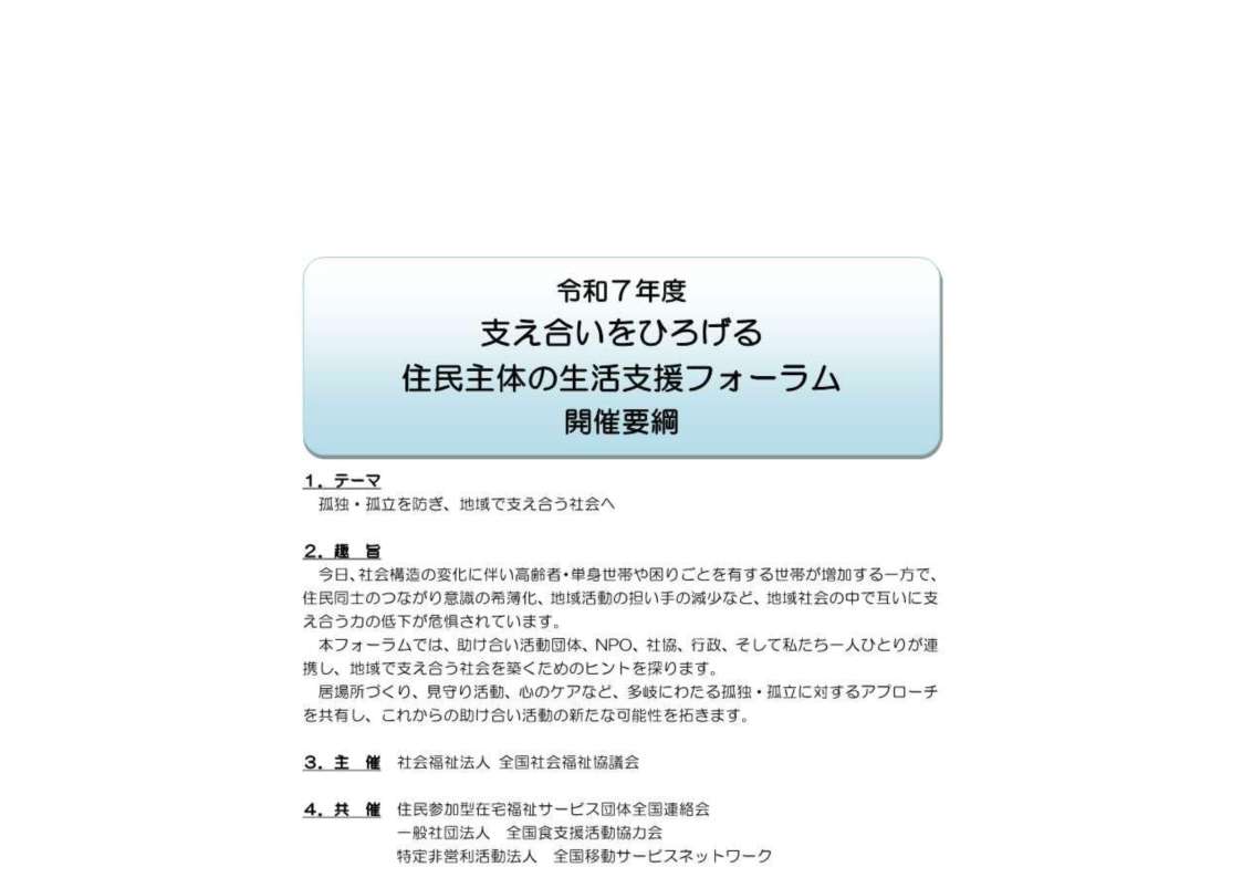 れています。本フォーラムでは、助け合い活動団体、NPO、社協、行政、